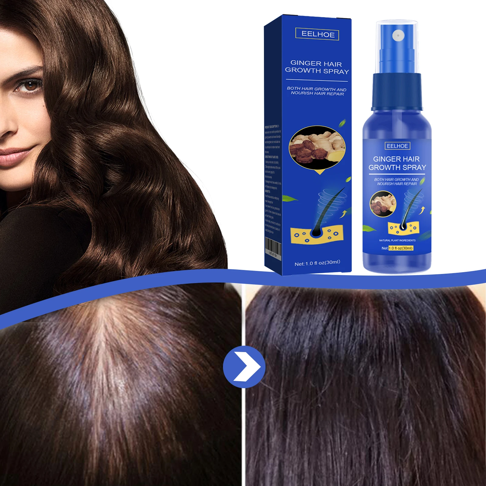 Our ginger hair dense spray contains panthenol, glycerin. It helps to penetrate into the root of hair follicles, activate dormant hair follicles, and promote hair regeneration, resulting in fuller and fluffier hair. Its usage is simple: wash your hair clean, rub it until it dries. Apply an appropriate amount of this product evenly to the area of hair loss. Massage the area of hair loss with fingertips or a massage stick for 2-3 minutes. No more hair loss after use, and no longer worry about thick hair.